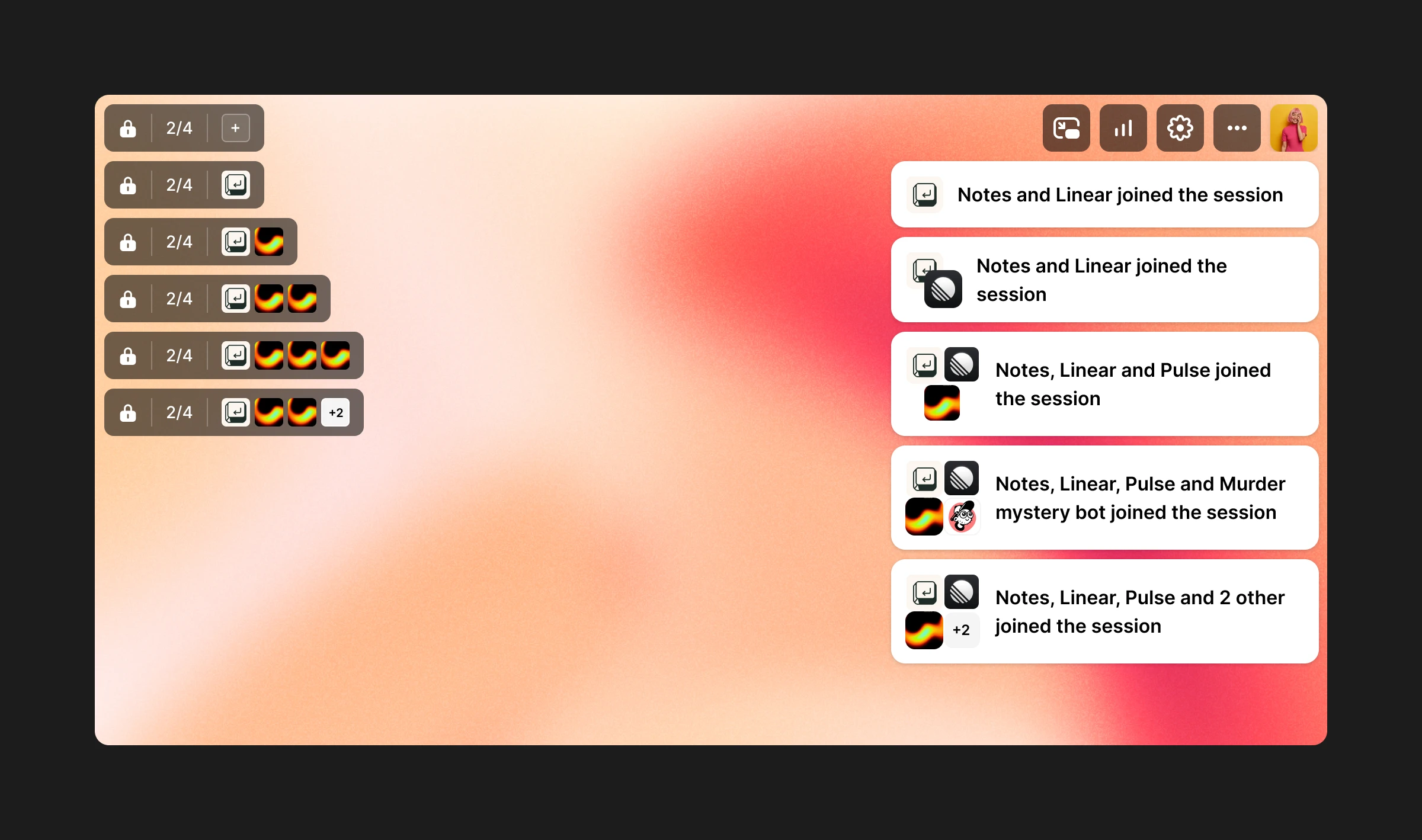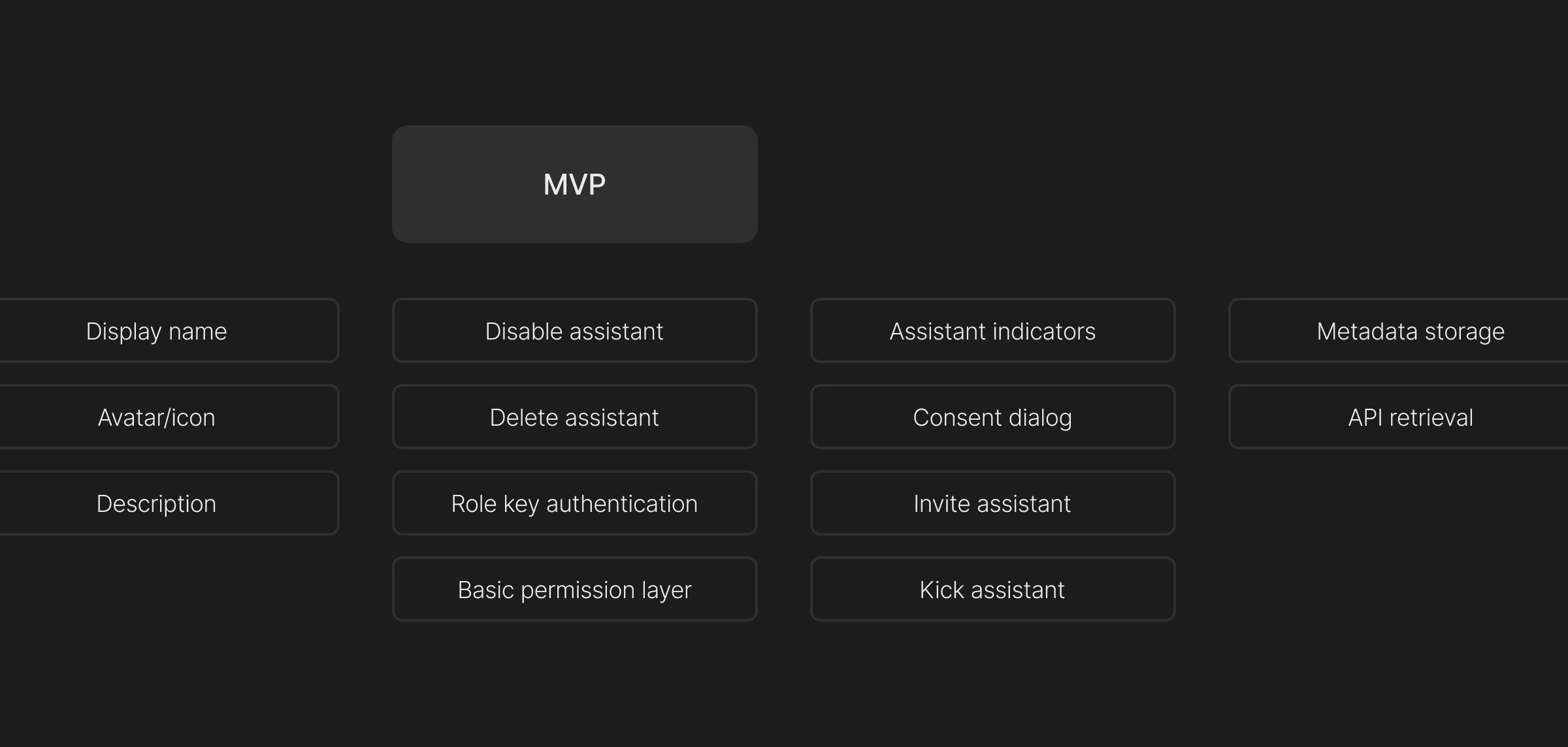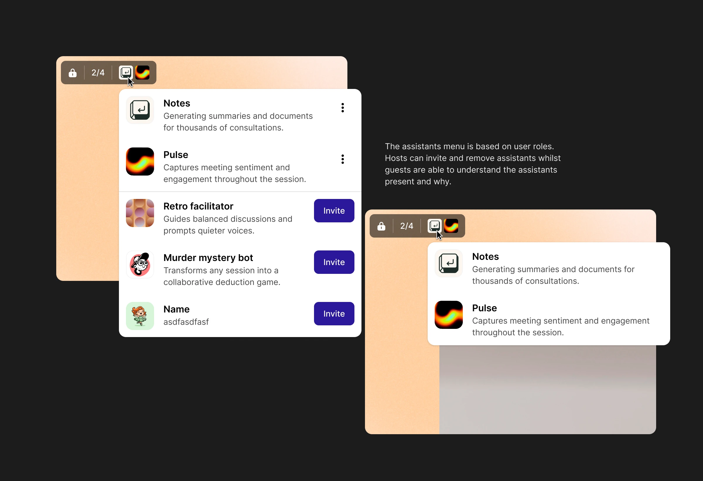 A key design decision was to put trust first. Instead of working invisibly in the background, Assistants show up in the room. They have a name, avatar, and clear purpose so participants understand who’s present and why.