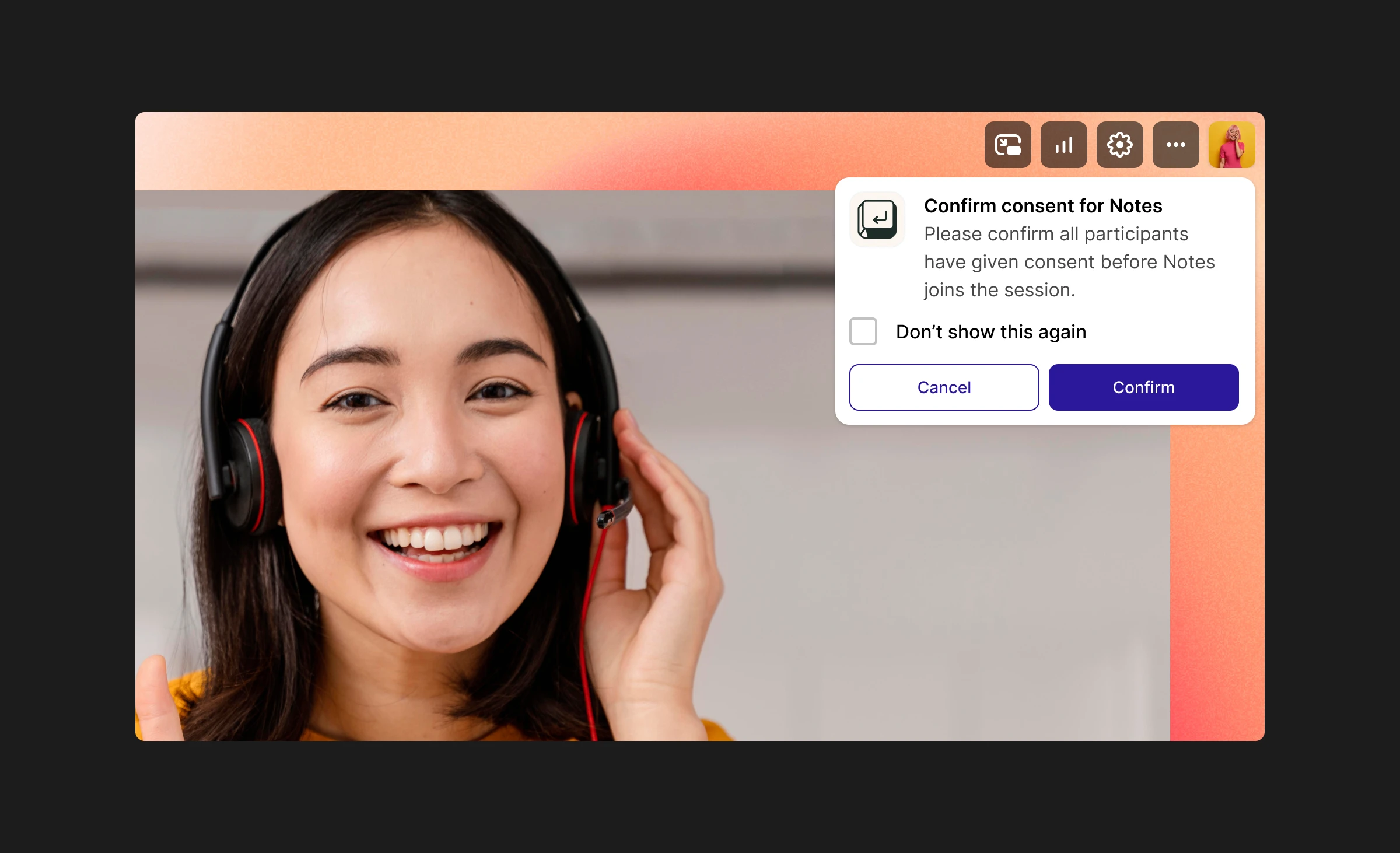 Another key contributor to trust was a consent dialog. AI Adoption, specifically in Telehealth, can be challenging and gently reminding clinicians to ensure their visitors are aware and happy with the use of an assistant builds confidence to both the Telehealth provider and their clinician’s workflow.