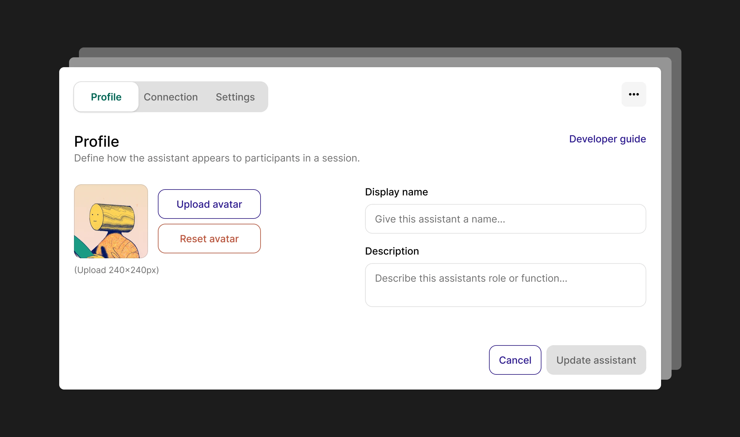 Assistants starts in a customer's dashboard. This is where builders assign the components of our trust model. A name, avatar and description.